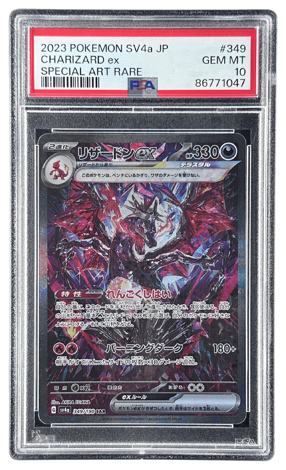 | 商品の特徴 | 2023 CHARIZARD ex 特別アートレア リザードン リザードンex | TCG STORE。2023 CHARIZARD ex SPECIAL ART RARE - メルカリ。☆PSA10☆【英語版/Charizard ex/リザードンex/SAR】234。2023年発行のCHARIZARD ex、SPECIAL ART RARE、GEM MTグレード、HP330の高レアリティカード。- モデル名: CHARIZARD ex- 年: 2023- レアリティ: SPECIAL ART RARE- グレード: GEM MT- HP: 330- カード番号: #349 リザードンvmas ssrご覧いただきありがとうございます。。Amazon.co.jp: Pokemon Card Sv3 Expansion Pack, Ruler of Black。★PSA10★【こくばバドレックスVMAX/HR/SA/S6K】086/070 | ||